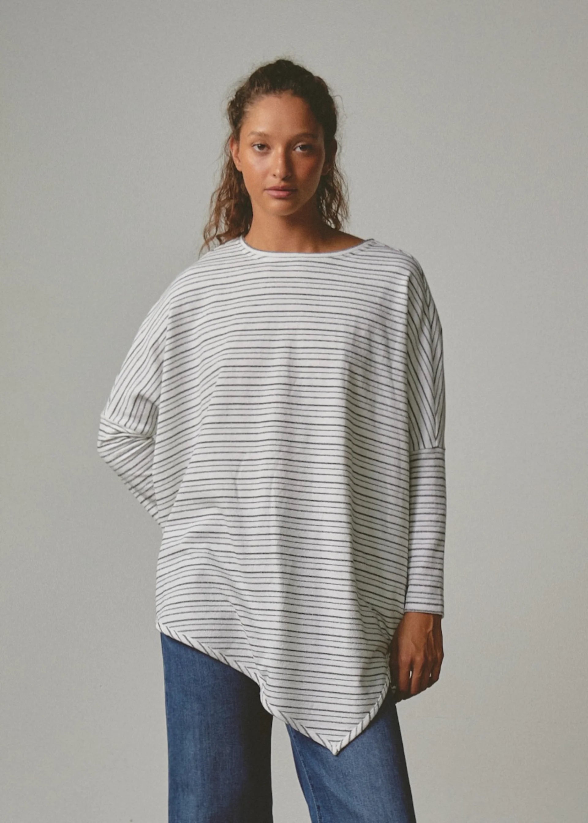 Loose striped blouse in off-white and black. Its relaxed silhouette and asymmetric drape bring natural movement to the look. A versatile piece that blends everyday comfort with the timeless elegance that defines Inmaculada.