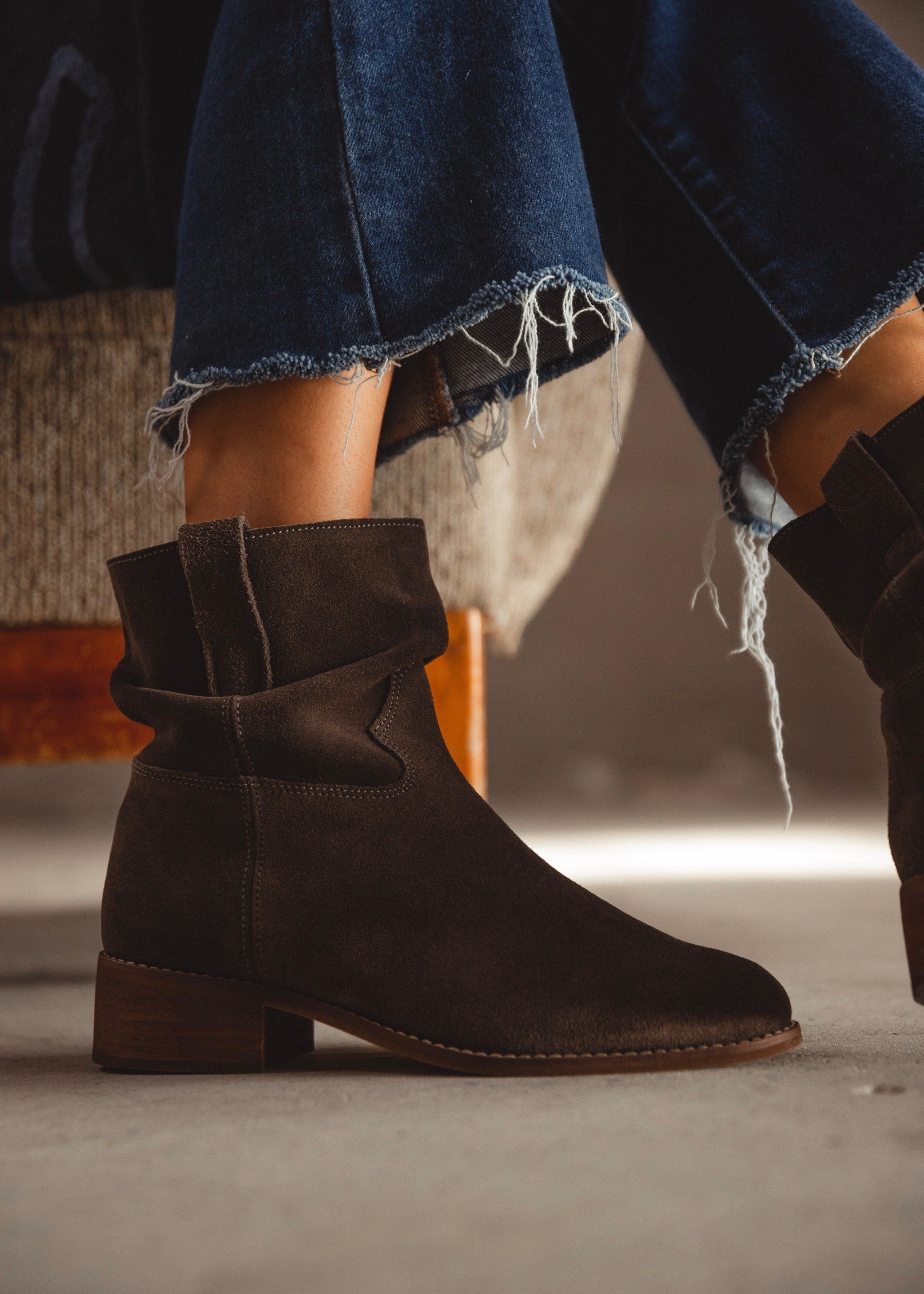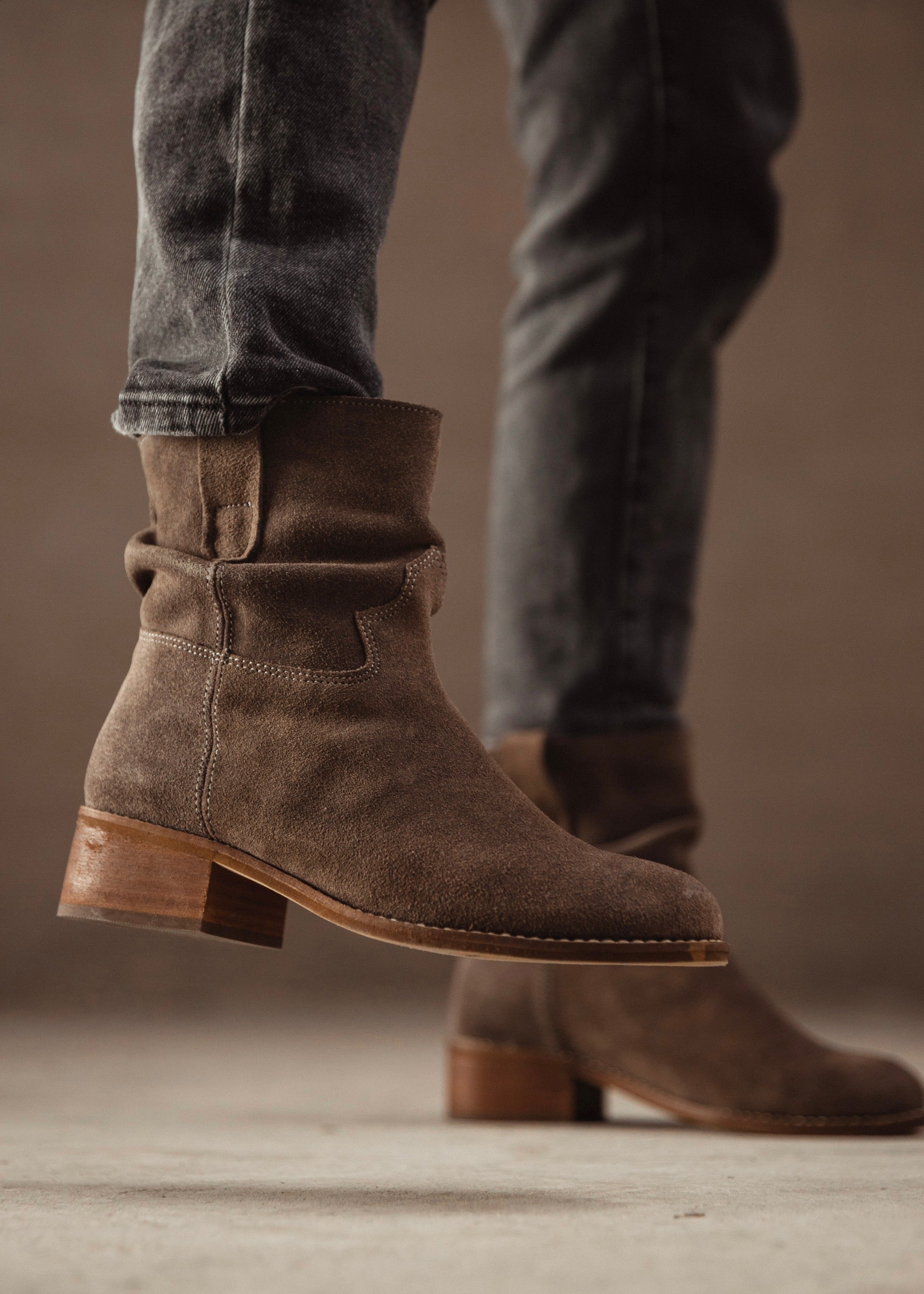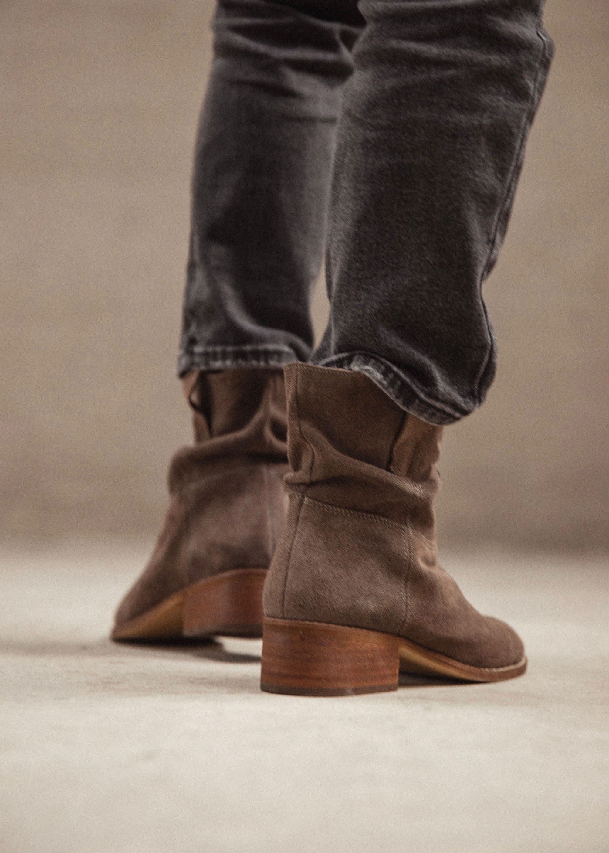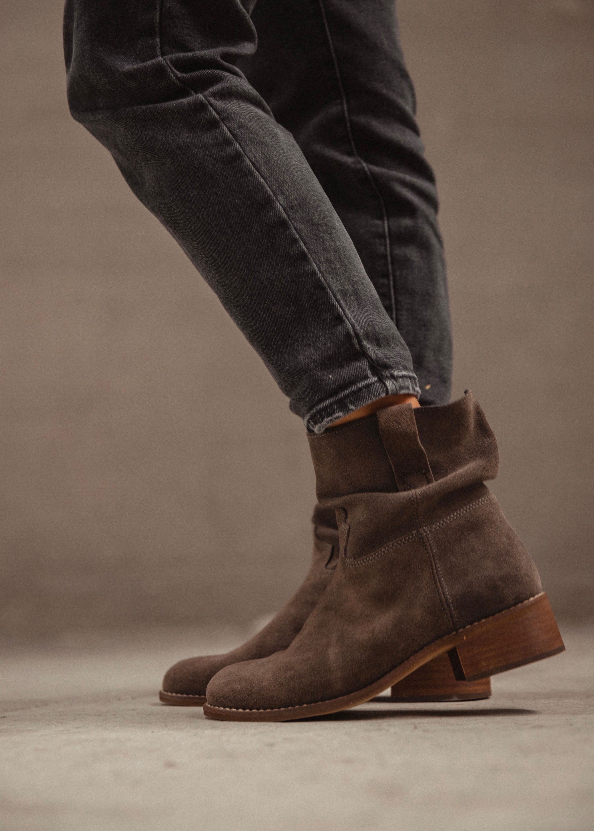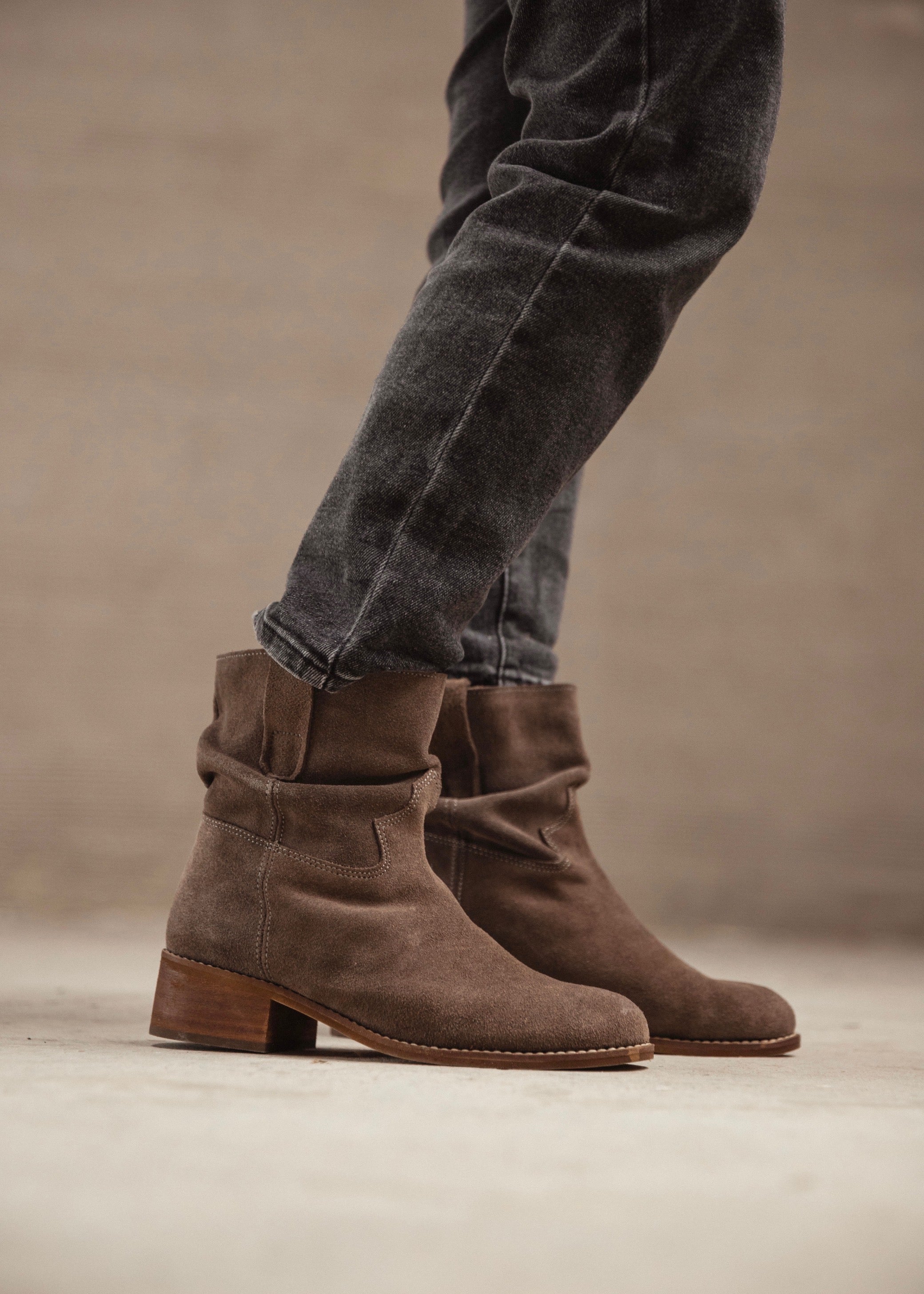 Suede leather ankle boots with a relaxed mid-calf shaft and low wooden heel. Timeless, versatile, and comfortable — made to accompany every step with natural elegance and effortless style.