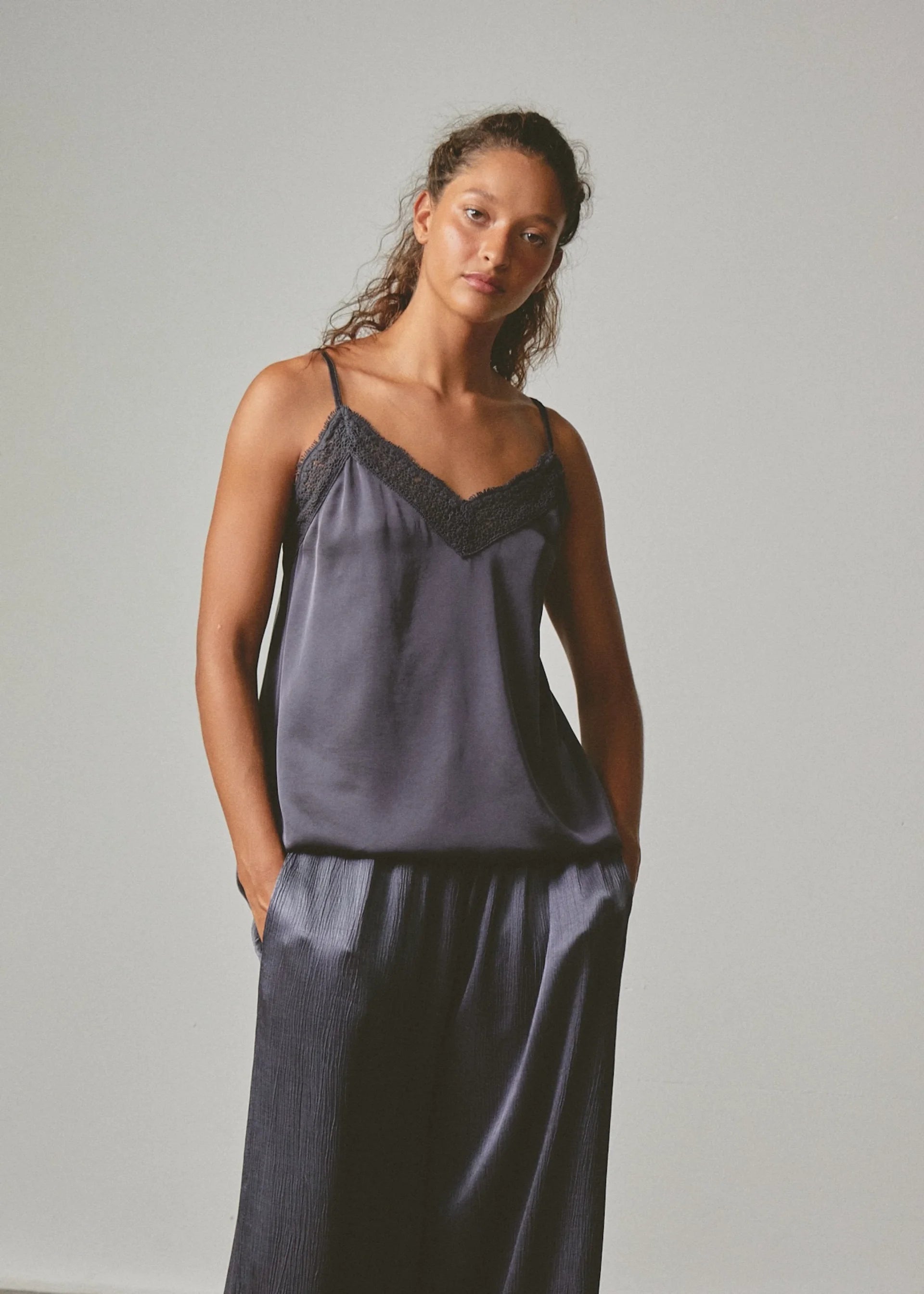 Delicate camisole with thin straps and lace detailing along the neckline. Its satin-like texture and fluid drape bring a feminine and sophisticated touch — perfect for layering or wearing as a statement piece.