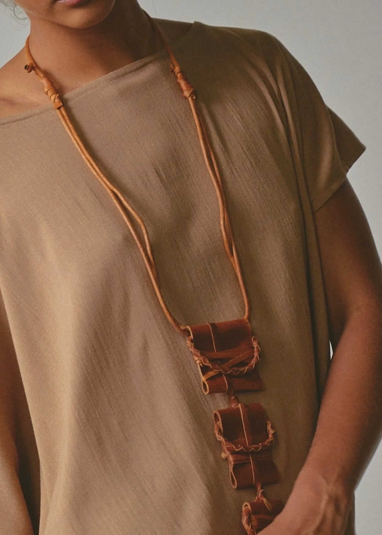 Handcrafted in leather, this necklace elevates any look. A true statement piece for those who embrace elegance with originality.
