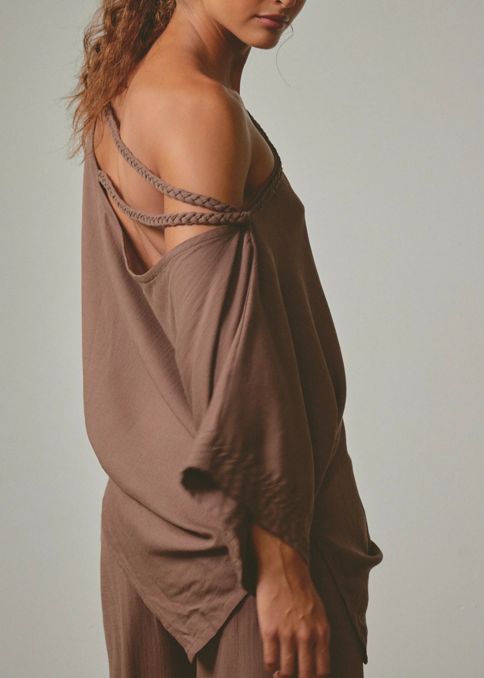 Relaxed silhouette blouse featuring a braided detail on the neckline and back. A fluid design that highlights delicate movement with every step.